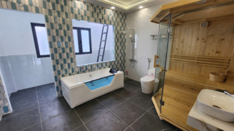 • Phòng khách trần cao 6m, đèn pha lê sang trọng, phản đá tự nhiên.
